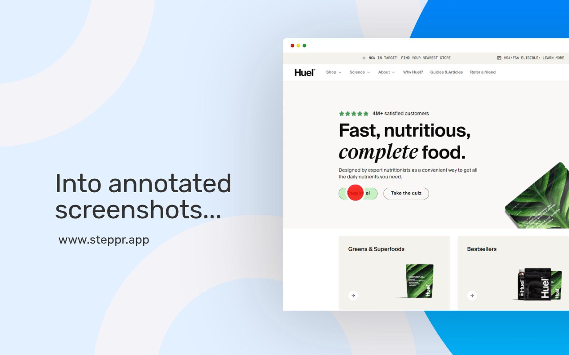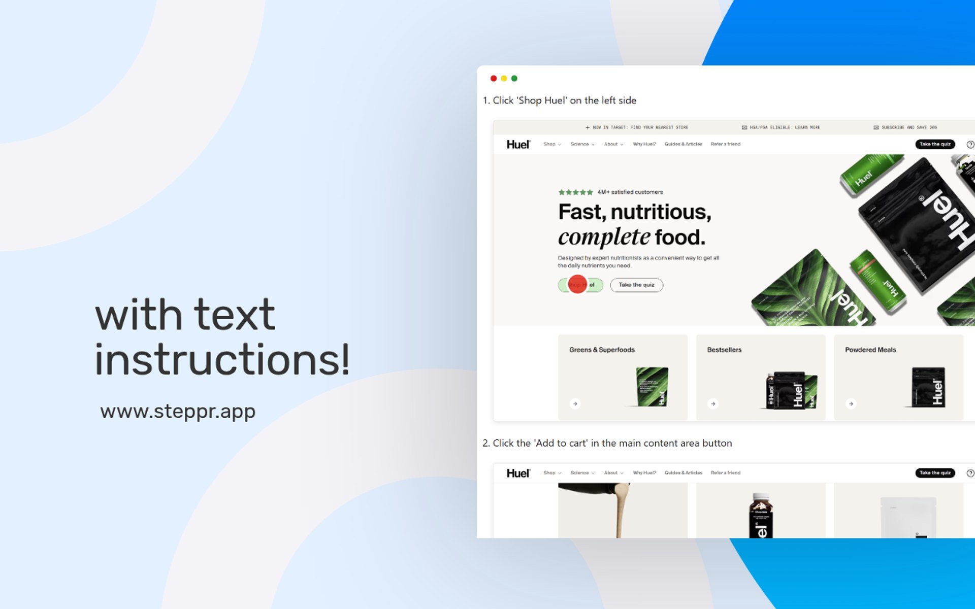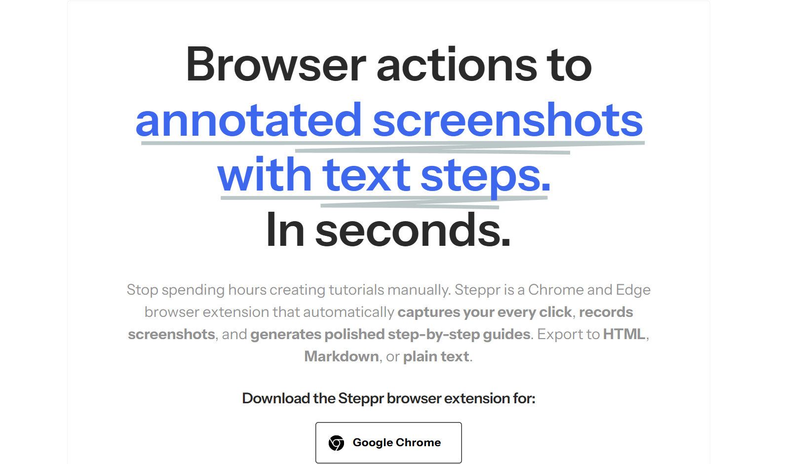 Steppr is a Chrome extension that turns any browser workflow into professional documentation. Click "Record," do your task, and get a complete guide with numbered steps and annotated screenshots. Export to HTML, Markdown, or plain text.
